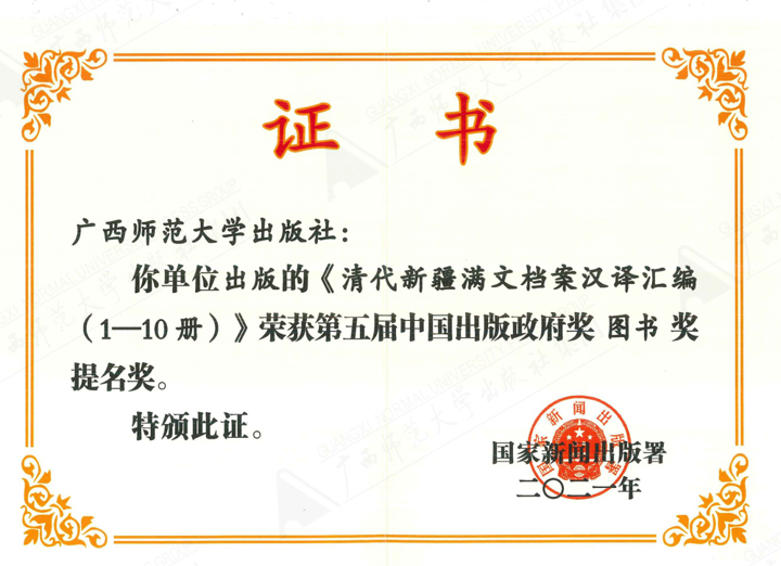 《清代新疆满文档案汉译汇编(1-10 册)》获第五届中国出版政府奖图书奖提名奖