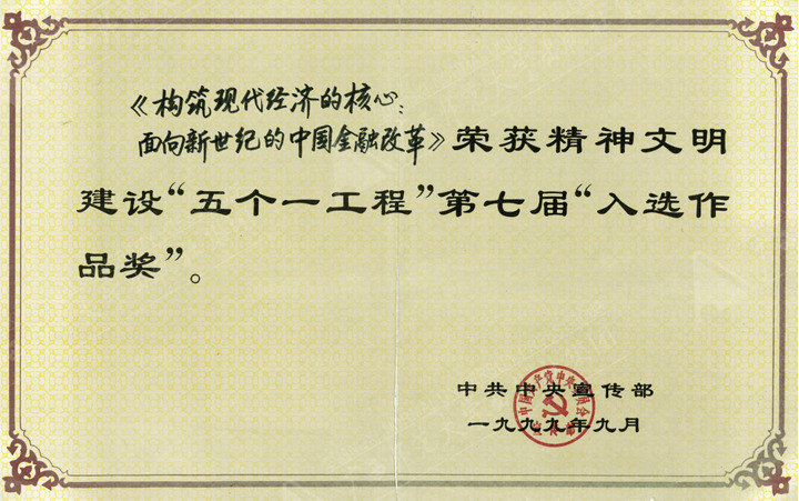 《构筑现代经济的核心——面向新世纪的中国金融改革》获中宣部精神文明建设“五个一工程”第七届“入选作品奖”
