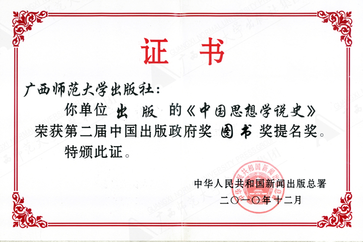 《中国思想学说史(9册)》获第二届中国出版政府奖图书奖提名奖