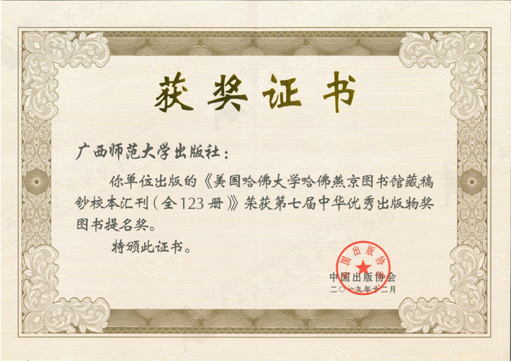 《美国哈佛大学哈佛燕京图书馆藏稿钞校本汇刊(全123册)》获第七届中华优秀出版物奖图书提名奖