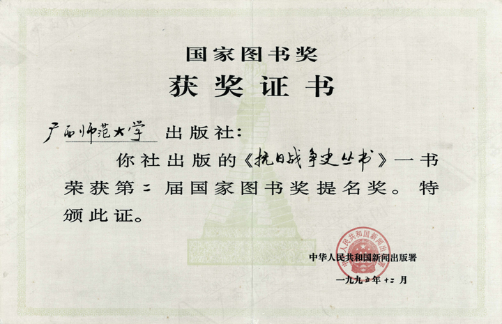 “抗日战争史丛书”获第二届国家图书奖提名奖