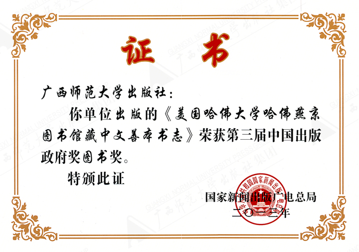 《美国哈佛大学哈佛燕京图书馆藏中文善本书志》获第三届中国出版政府奖图书奖